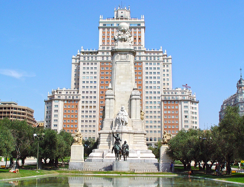 La plaza de España de Madrid es una amplio espacio ajardinado en el casco histórico de la ciudad, en cuyo centro se encuentra una fuente monumental dedicada a Miguel de Cervantes. Hace de eje continuador uniendo la Gran Vía con la calle de la Princesa.