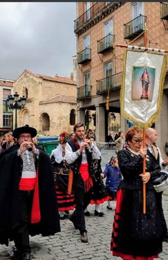 La fiesta es de un colorido muy especial , ya que van acompañando a la Santa , con sus trajes regionales y bailando a los pies de las andas , en una procesión única en España .