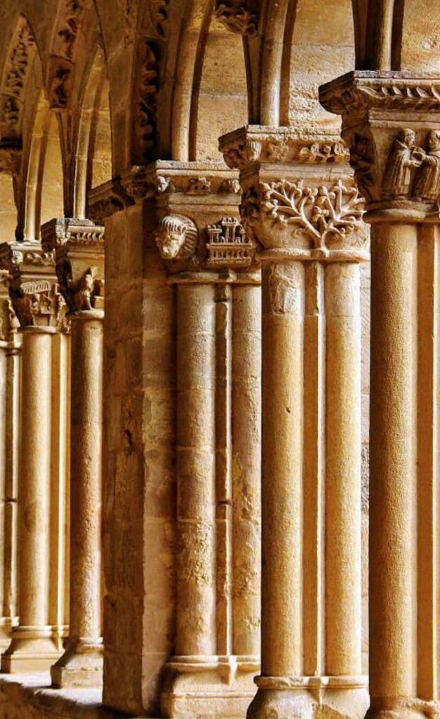 El Claustro de Santa María con sus columnas y capiteles , está esculpido , reflejando acontecimientos cotidianos de la Edad Medía , como escenas bíblicas , solariegas , Heráldica , todo en unas esculturas muy bellas y sorprendentes .