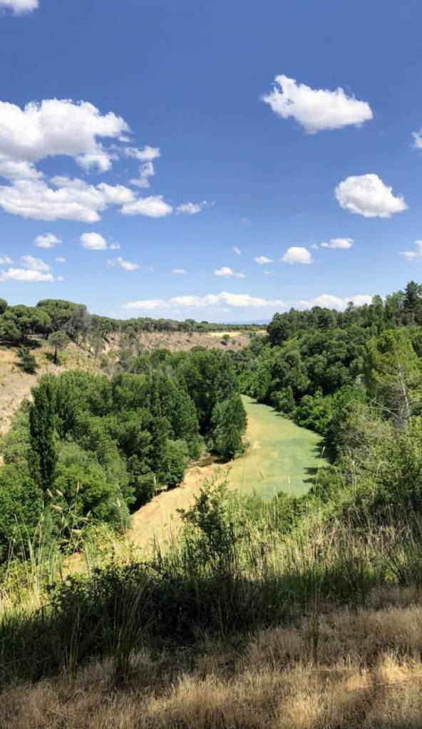 Salimos de la población por la calle Real , enlazamos con la carretera que se dirige hacia Navas de Oro , y después de pasar la Ermita del Santo Cristo nos desviamos a la izquierda , cogemos una pista amplia y continuamos hasta atravesar las vías del AVE por un túnel , cruzamos el Arroyo Balisa y nos adentramos en un pinar , tras unos cientos de m. , llegamos al Cañón del río Eresma y durante cinco km . lo acompañamos a nuestra derecha , hasta llegar a nuestro final de etapa en la localidad de Coca , muy atentos a la señalización , antes de llegar por los pinares .