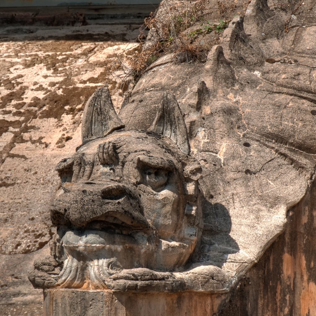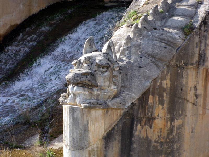 El aliviadero de la presa del Vado (la primera, que algunos llaman la falsa) está formado por tres compuertas que se apoyan y sujetan en cuatro columnas, cuya base se ensancha y curva en la parte posterior. Agazapados sobre las columnas centrales hay dos dragones, macho y hembra, tendidos al sol. Creo que Antonio nos ha traído al lugar donde hace siglos nuestros dos dragones se tumbaron aquel día para quedarse siempre juntos.