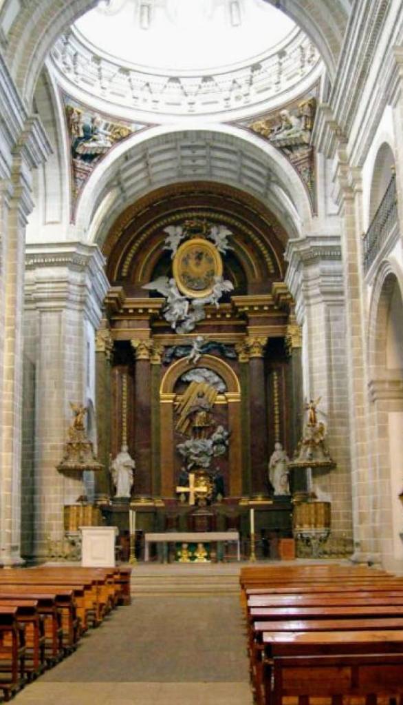 En interior Altar Mayor siglo XVII con Retablo Barroco escoltado con columnas de estilo salomónico y en el centro un Sagrario con Ángeles decorando la puerta y cuatro columnas helicoidales .