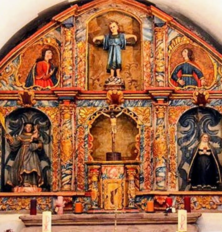 Lo sorprendente está en el interior ofreciendo un pequeño Retablo muy colorista presidido por un Cristo Crucificado sobre el Sagrario , y en la parte superior un Niño Jesús en actitud Crucificada.