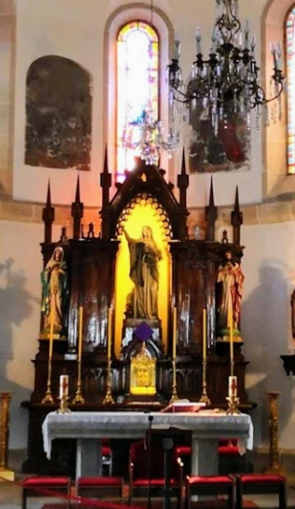 En interior Retablo Neogótico con las imágenes de Santiago Peregrino , San Juan Bautista y San Roque del siglo XVIII .