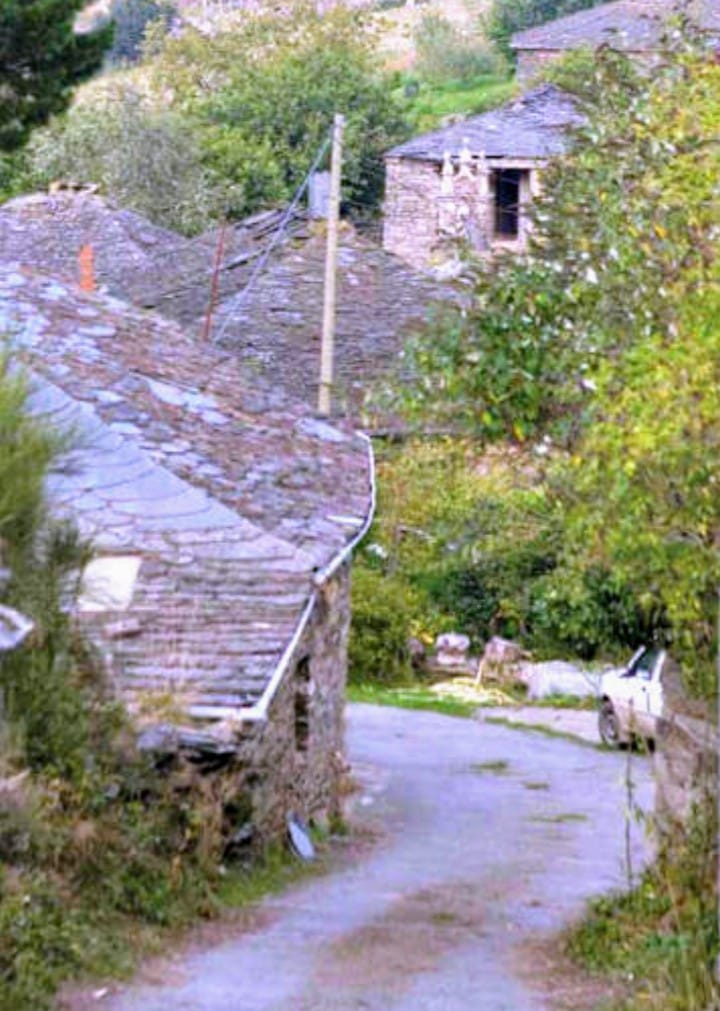 Después de disfrutar esta preciosa aldea donde la arquitectura de pizarra deja toda su armonía , continuamos camino dividiéndose en tres partes , nosotros seguimos el señalizado del frente enlosado en pizarra y desembocando en la carretera comarcal que seguiremos hasta un desvío señalizado a derecha , y este entre arboleda autóctona sin dejarlo nos hará llegar a la aldea de «O’ Biduedo» .