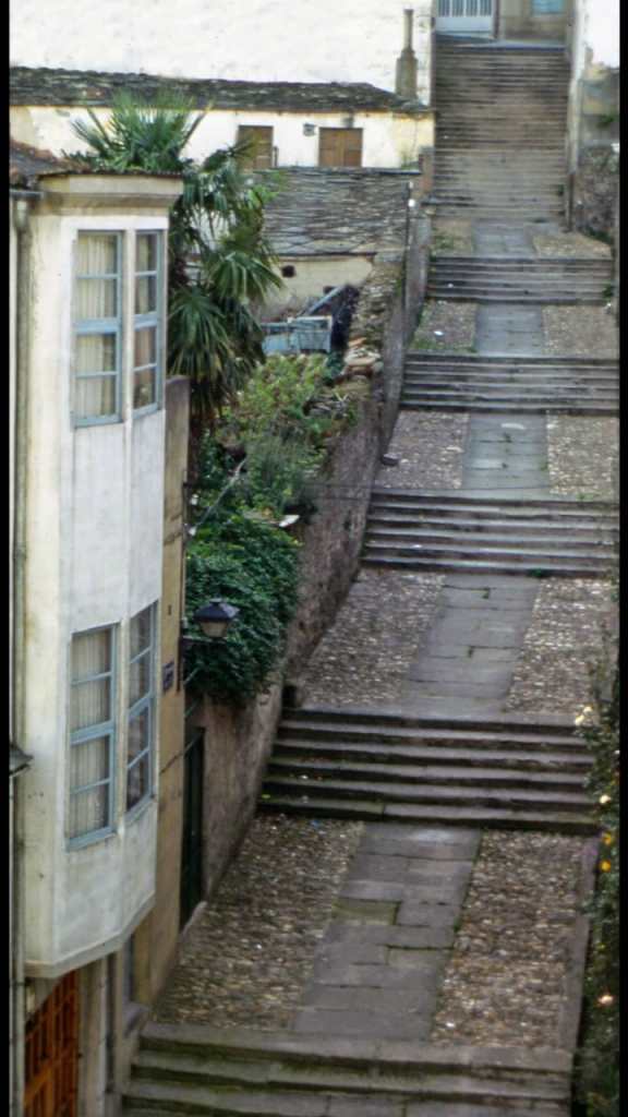 Callejeando por dónde indica el Camino pasaremos por Rúa de Calvo Sotelo , Maestre Saavedra , y Rúa del Peregrino , cruzaremos el río Sarria y por Avda. de Benigno Quiroga llegamos a la «Escalinata Maior», punto inevitable del Camino donde los peregrinos suben hasta la Rúa Maior fin de la etapa de hoy .