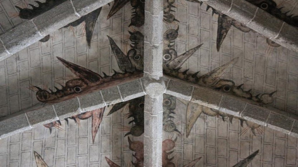 Hay que destacar el inesperado descubrimiento de pinturas de dragones del siglo XV ocultas en una de sus bóvedas, algo inaudito en el arte sacro.