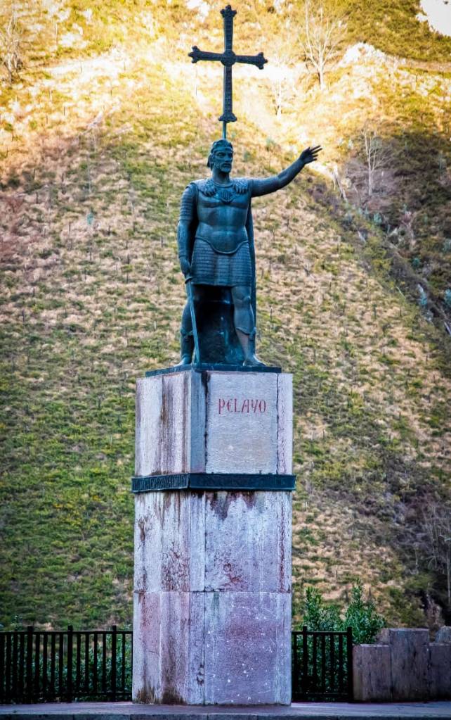La escultura de bronce es de tamaño considerable , representa al rey Don Pelayo sosteniendo la espada y levantando el brazo en alto . Fue puesta en la esplanada en el año 1965 y es obra del escultor Geraldo Zaragoza .
