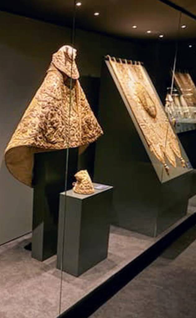 Ya en la planta alta del Museo , contemplamos los distintos mantos de la Virgen , distintas casullas , cálices , y piezas de orfebrería de gran valor , muchas de ellas donadas a lo largo de los años , por reyes , reinas , particulares nobles , mecenas , estamentos , etc …. .